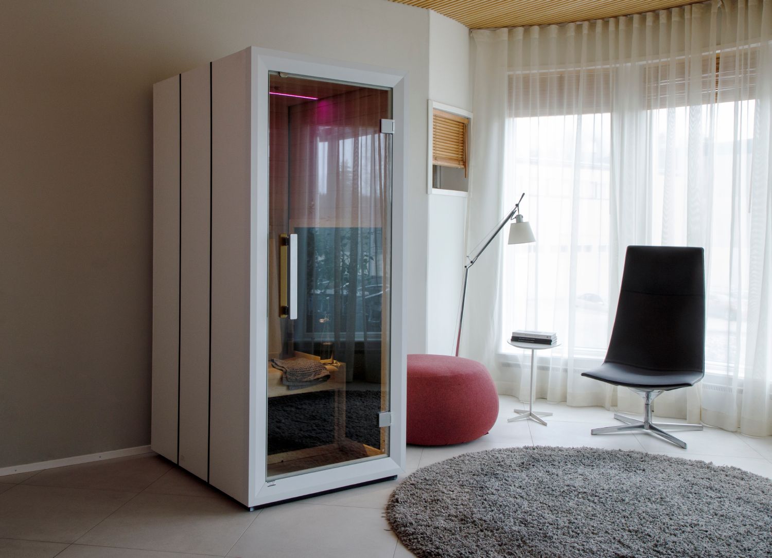 Harvia Spectrum Mini er einmanns infrarauður klefi hannaður með nútímalegan stíl í huga. Nútímalegur ytri stíllinn passar fullkomlega við innréttingu úr hemlokki, og innan í klefanum upplifir þú lúxus með aukastórum koltrefjapanelum sem hita. Sex hitapanelar hita líkamann þinn innan frá með infrarauðum geislum, sem eru lágt á EMF kvarðanum. Þú getur hlustað á uppáhalds tónlistina þína með innbyggðum Bluetooth hátölurum eða einfaldlega slakað á við mótaða bakstoð. Stilla má hitastig, tíma og fleira með stafrænu stjórnborði.